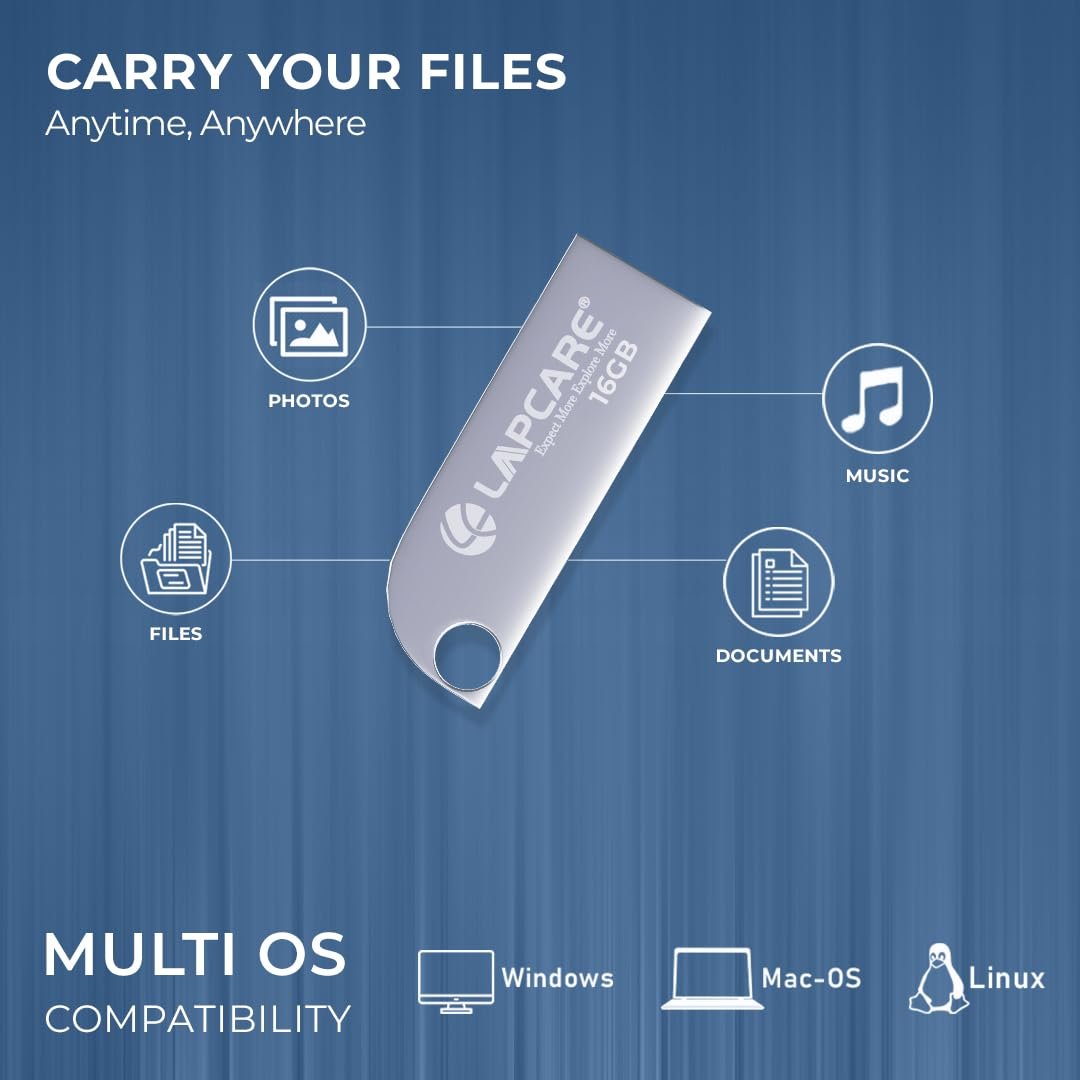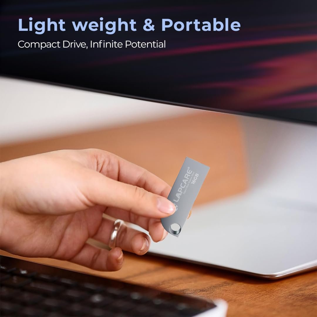 The Lapcare LPD303-16GB USB 2.0 Pen Drive offers reliable performance with 16GB storage, fast 100 Mbps data transfer, and a sleek metal design. Lightweight and portable, it supports password protection, data encryption, and works seamlessly with laptops, desktops, and all major operating systems—ideal for students, professionals, and everyday users.